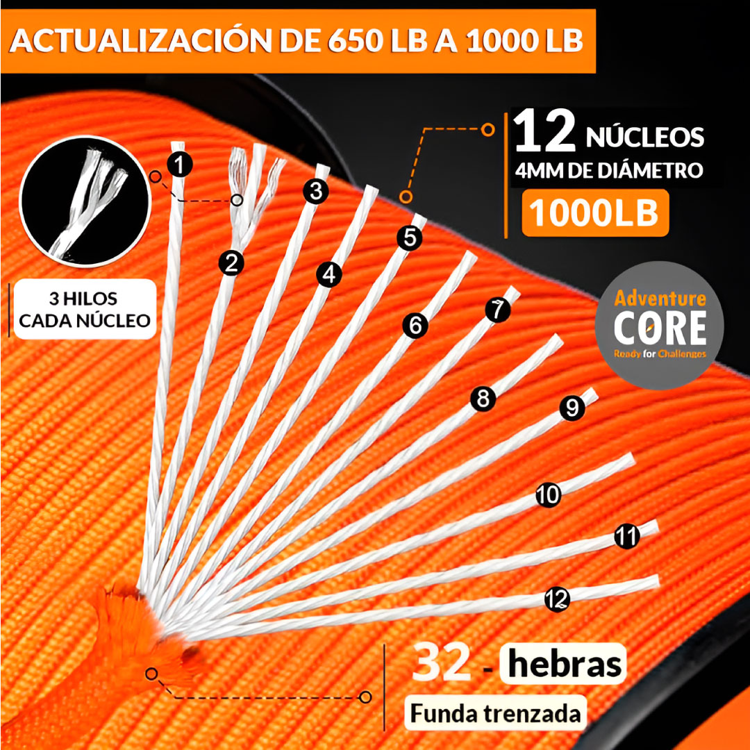 🔝 Actualización a 1000 libras de resistencia: Capacidad menorada de nuestro Paracord tipo III de 550 libras a una increíble resistencia de 1000 libras, ¡una fuerza que te brinda seguridad en cada uso! Nuestro Paracord está diseñado con un núcleo interior de 12 hebras y un revestimiento trenzado de 32 hebras, lo que proporciona un 250 libras más de resistencia que las cuerdas estándar de paracaídas de 750 libras. El grosor de 4 mm (0.157 in) te garantiza durabilidad y confiabilidad en todas las condiciones.